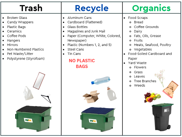 All trash, recyclables, and organic materials should be placed inside its designated container with the lid fully closed for collection. All recyclables and organic materials must be placed loosely in their respective containers to avoid contamination. Bags that are certified compostable are not permitted in the organic's container and should be placed in the trash bin. For more information on what items can be placed in each container, click the Commercial and Multi-Family Basic Levels of Service tab.