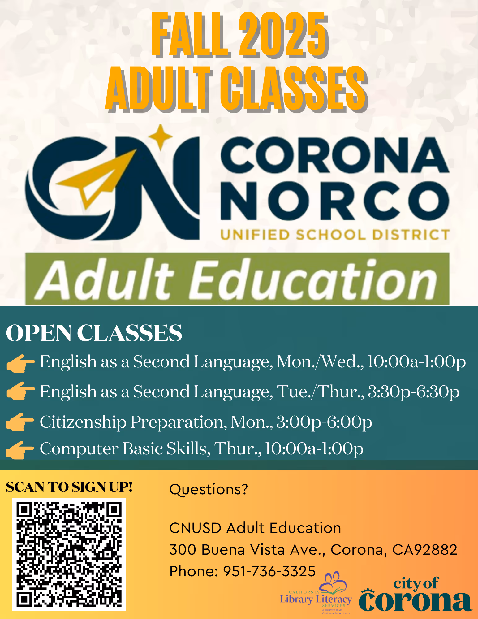 For more information, email at Literacy.Corona@CoronaCA.gov OR call (951) 279-3746.