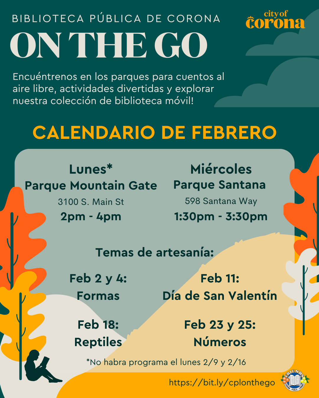 Library On-the-Go se encuentra en varios parques de la ciudad de Corona sin cita previa. Los horarios regulares se programan todos los meses, y los miembros de la comunidad pueden visitarlos para participar en actividades temáticas, asistir a la hora de los cuentos en un entorno al aire libre, hacer ejercicio con equipos deportivos, registrarse para obtener tarjetas de la biblioteca u otros servicios del departamento, sacar o devolver materiales de la biblioteca, suscribirse al boletín del departamento y obtener información relacionada con los servicios bibliotecarios y comunitarios. ¡Esperamos conocerlo la próxima vez que salgamos!