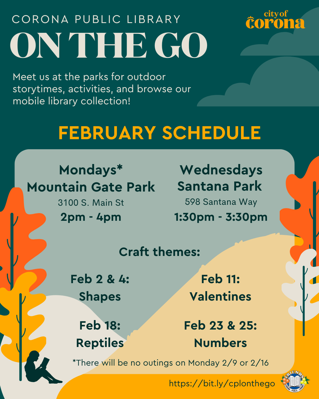 On the Go outings may be cancelled in cases of extreme heat or inclement weather. Cancellations will be posted to the Corona Public Library's Instagram page @coronapublib.